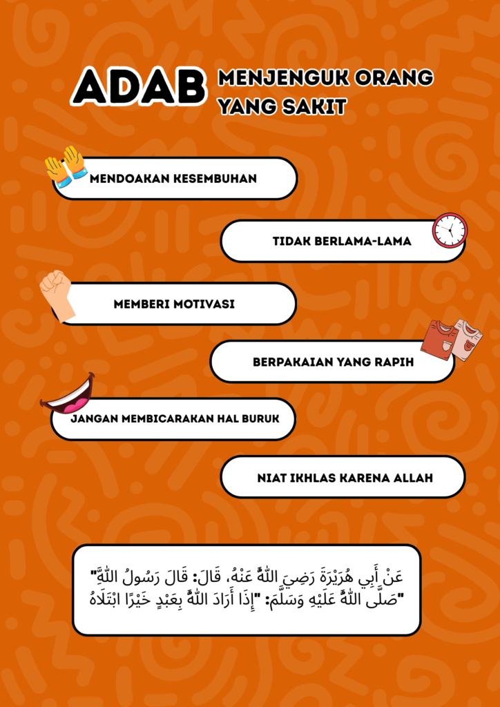 Adab Menjenguk Orang Sakit Ini adalah poster adab menjenguk orang sakit project dari pelajaran adab2 saya membuatnya di canva desainnya cukup simple semoga adab2 ini bisa di terapkan oleh para pengunjung website saya